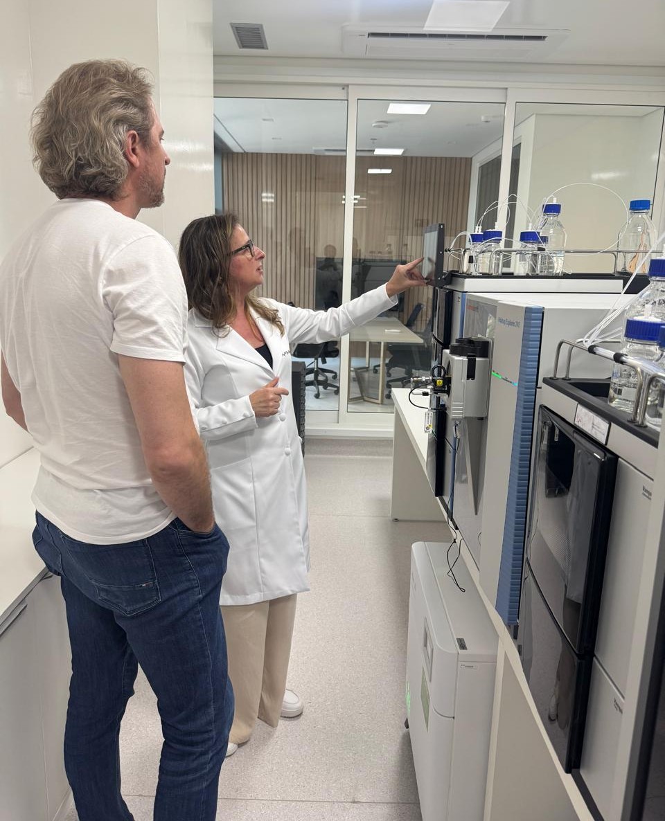 Durante a visita, a Dra. Renata explicou ao deputado o impacto clínico do equipamento de alta resolução disponível no laboratório. Segundo ela, a técnica funciona como uma “balança molecular extremamente precisa”, capaz de medir o peso exato de moléculas em amostras biológicas, como sangue e biópsias, com grande sensibilidade.